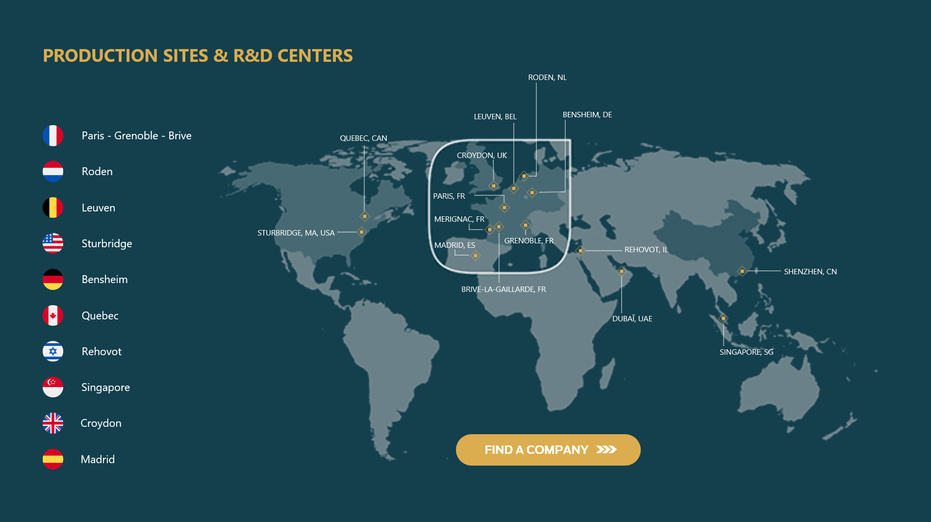 Exosens dispose d’une empreinte industrielle mondiale, avec un siège social situé à Mérignac, en France, et des sites de production en France, aux Pays-Bas, en Belgique, aux États-Unis, en Allemagne, au Royaume-Uni et au Canada. Ces sites constituent des pôles d’excellence où des équipes pluridisciplinaires conçoivent, développent et fabriquent des solutions à haute performance.
